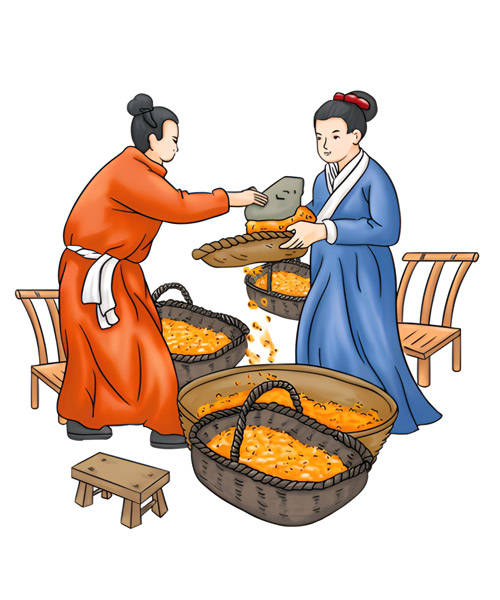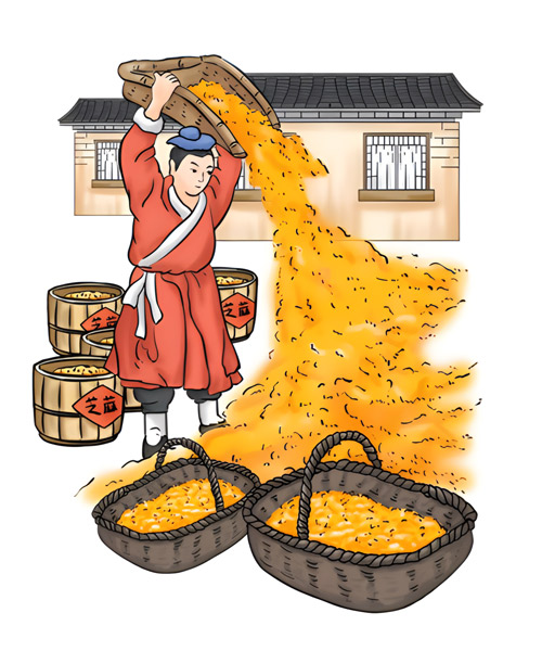 • 漂洗后的芝麻,以鐵鍋碳火慢炒至香味溢出。其中炒芝麻的手法、火候及加料工藝等,都以獨特的秘訣形式由師徒間代代傳承。
