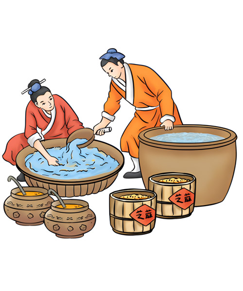 • 芝麻經(jīng)過漂洗浸泡,既清除了芝麻中的并肩泥等雜質(zhì),又讓水分充分滲透到完整細胞內(nèi)部,使凝膠體膨脹,再經(jīng)過加熱炒籽,就可以使細胞破裂,油體原生質(zhì)流出。
